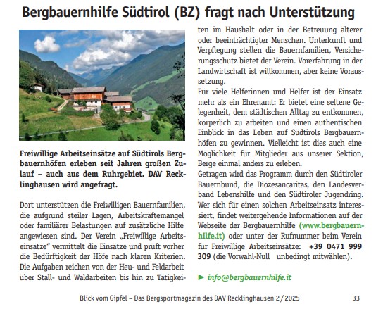 Freiwillige Arbeitseinsätze auf Südtirols Bergbauernhöfen erleben seit Jahren großen Zulauf – auch aus dem Ruhrgebiet. DAV Recklinghausen wird angefragt. Dort unterstützen die Freiwilligen Bauernfamilien, die aufgrund steiler Lagen, Arbeitskräftemangel oder familiärer Belastungen auf zusätzliche Hilfe angewiesen sind. Der Verein „Freiwillige Arbeitseinsätze“ vermittelt die Einsätze und prüft vorher die Bedürftigkeit der Höfe nach klaren Kriterien. Die Aufgaben reichen von der Heu- und Feldarbeit über Stall- und Waldarbeiten bis hin zu Tätigkeiten im Haushalt oder in der Betreuung älterer oder beeinträchtigter Menschen. Unterkunft und Verpflegung stellen die Bauernfamilien, Versicherungsschutz bietet der Verein. Vorerfahrung in der Landwirtschaft ist willkommen, aber keine Voraussetzung. Für viele Helferinnen und Helfer ist der Einsatz mehr als ein Ehrenamt: Er bietet eine seltene Gelegenheit, dem städtischen Alltag zu entkommen, körperlich zu arbeiten und einen authentischen Einblick in das Leben auf Südtirols Bergbauernhöfen zu gewinnen. Vielleicht ist dies auch eine Möglichkeit für Mitglieder aus unserer Sektion, Berge einmal anders zu erleben. Getragen wird das Programm durch den Südtiroler Bauernbund, die Diözesancaritas, den Landesverband Lebenshilfe und den Südtiroler Jugendring. Wer sich für einen solchen Arbeitseinsatz interessiert, findet weitergehende Informationen auf der Webseite der Bergbauernhilfe (www.bergbauernhilfe.it) oder unter der Rufnummer beim Verein für Freiwillige Arbeitseinsätze: +39 0471 999 309 (die Vorwahl-Null unbedingt mitwählen).