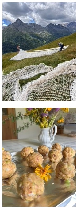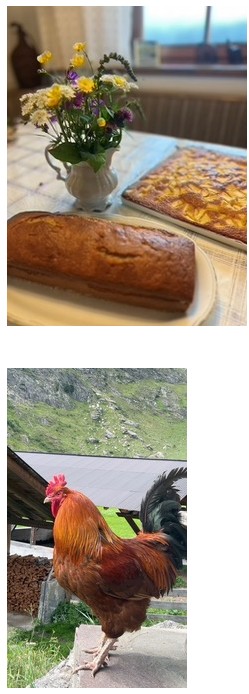 Nach den ersten Tagen voller Höhenmeter und Heu kam dann der Wetterumschwung: Regen. Aber statt Trübsal zu blasen, wurde der Bauernhof zur Gourmetküche: Käse-, Spinat, und Speckknödel, Marmorkuchen, Apfelschnitte und Bananenbrot. Jeden Tag bekam ich Besuch vom Gockel persönlich und auch die Hofkatzen interessierten sich für meine Backkünste – oder vielleicht auch eher für die Butterreste an meinen Fingern. Abends wurde dann beim Kräutertee oder einem Glas frischer Milch (etwas Süßes durfte auch nicht fehlen) ein bisschen übers Leben geplaudert und philosophiert warum die Kühe so entspannt sind.