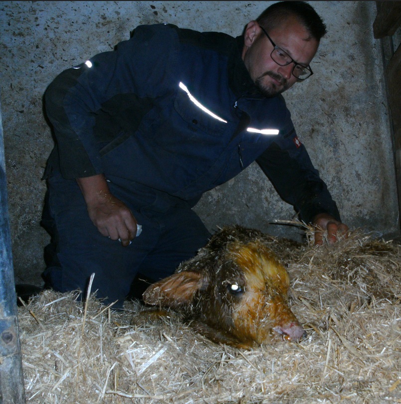 Eines Abends bin ich am Weg zum Abendessen, da kommt der Jungbauer ob ich im helfen will. Natürlich will ich, dafür bin ich doch hier. Ein Nachbar hat angerufen dass Kuh Nelke drei Wochen zu früh auf der Weide kalbt. Abendessen muß warten, ab ins Stallgewand und mit Jeep und Anhänger zur Weide und die Kuh in den Stall holen. Es wird dann eine Zwillingsgeburt. Ich war schon bei ein paar Abkalbungen dabei, aber es ist immer wieder ein besonderes Erlebnis.